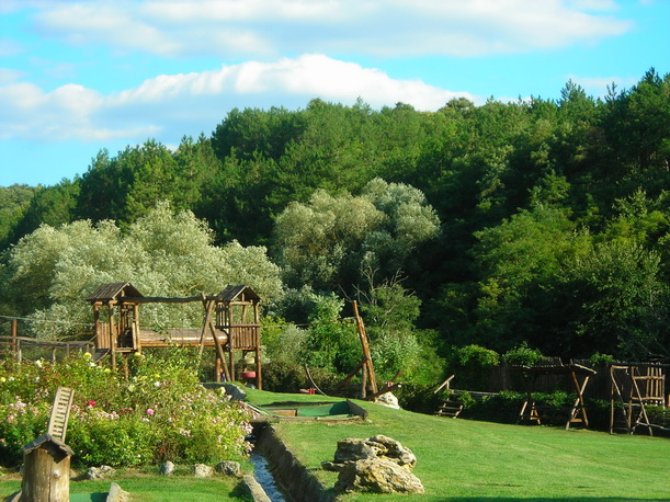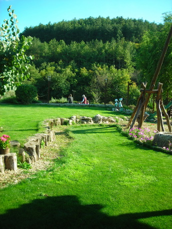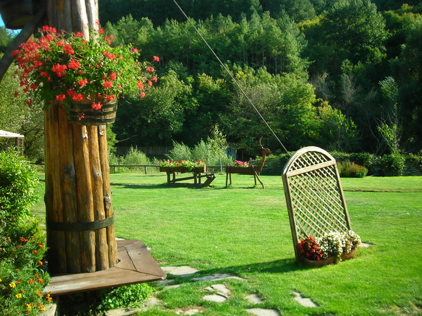 Среди ухоженных газонов и цветников видны красивые домики в этническом стиле, детская площадка
