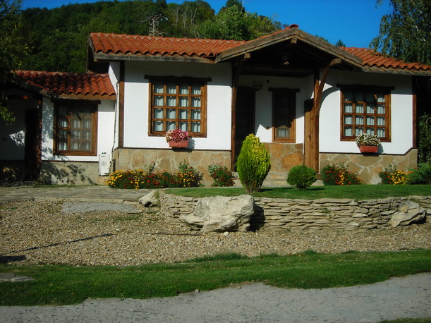 Среди ухоженных газонов и цветников видны красивые домики в этническом стиле, детская площадка